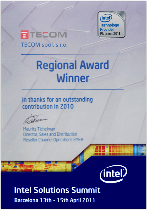Ve dnech 13.÷15. 4. 2011 jsme se zúčastnili konference Intel Solution Summit 2011. Jedná se o nejvýznamnější konferenci roku, kterou společnost Intel® pořádá pro své největší partnery. Letošní ročník byl pořádan v Barceloně a naše společnost získala významné a prestižní ocenění Regional Award Winner za inovativní přístup k dodávkám v oblasti serverových řešení.